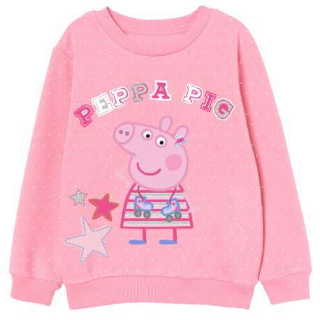 Bluza w różowym kolorze z ozdobnym nadrukiem bohaterki popularnej bajki Świnki Peppy. Bluza ozdobiona napisami, posiada małe kropki na całej powierzchni.