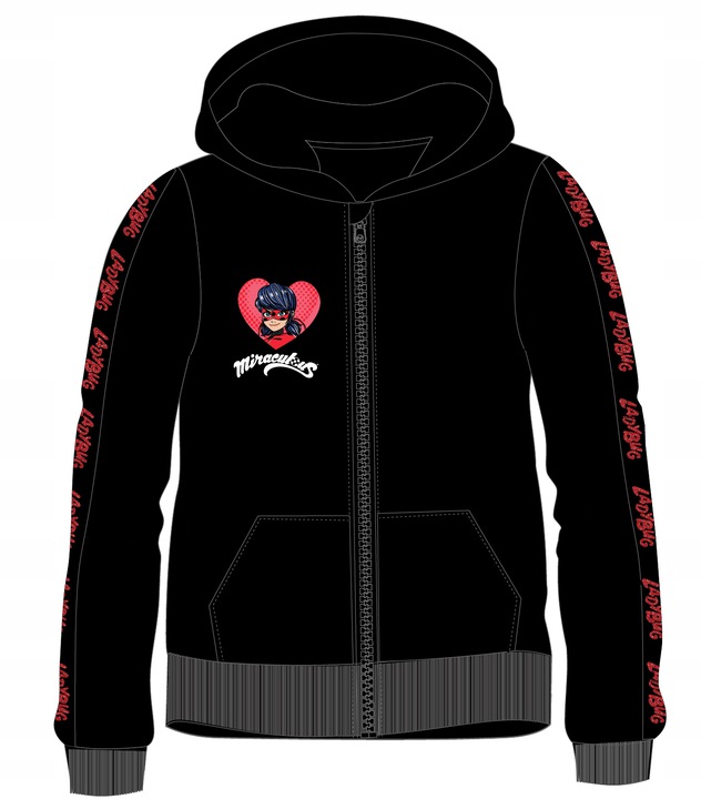 Klasyczna bluza zasuwana na zamek, z kapturem i dwiema kieszeniami. Dół i w rękawy wykończone ściągaczem. Na przodzie nadruk, na rękawach ozdobny lampas z napisem LADYBUG.