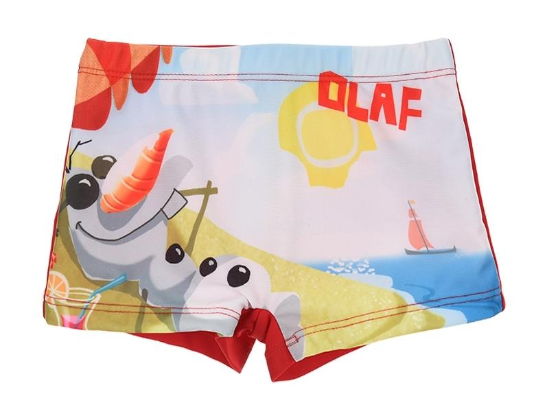 Spodenki kąpielowe dla małego fana Krainy Lodu z wizerunkiem ulubionego bihatera Olafa. Spodenki posiadają w pasie gumę.