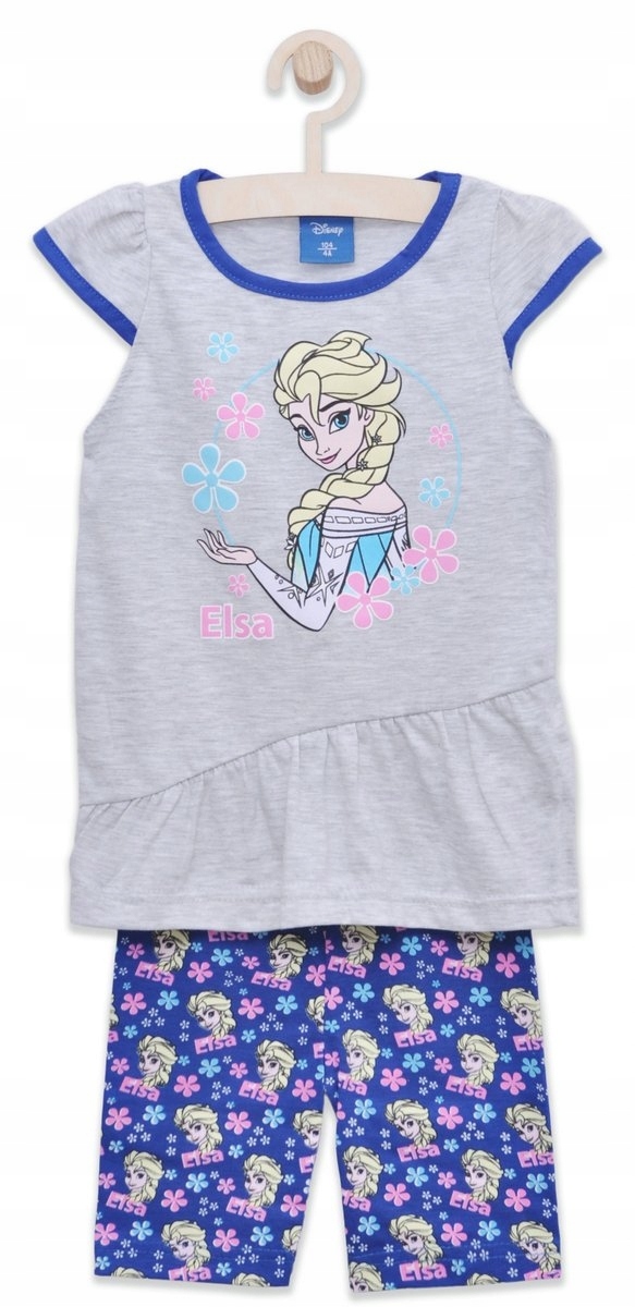 Komplet Kraina Lodu z Elzą w kolorze szarym. Bluzeczka w kolorze szarym, na przodzie nadruk Elzy. Bluzka posiada rękawki i obwódkę przy szyi w kontrastowym ciemniejszym kolorze. Na dole bluzeczki doszyta falbanka.