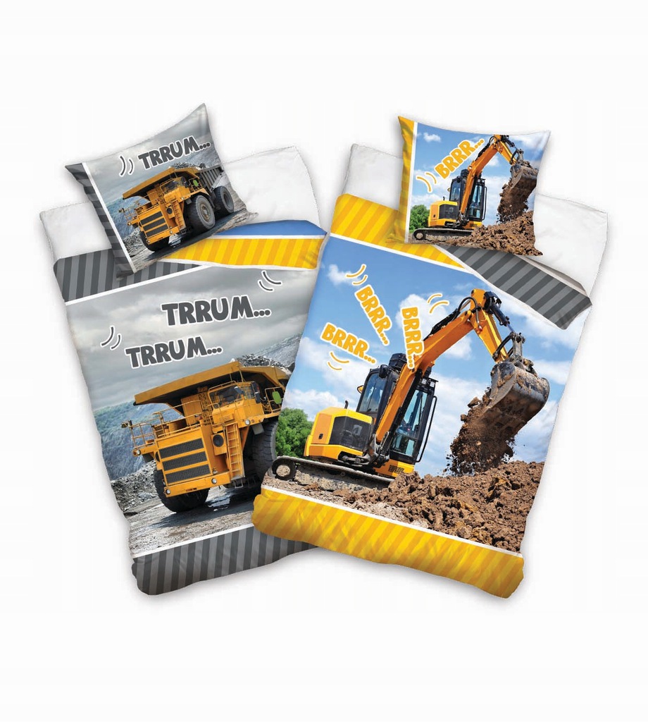 Jedna strona pościeli przedstawia koparke na żółtym tle, druga strona przedstawia wywrotke na szarym tle.