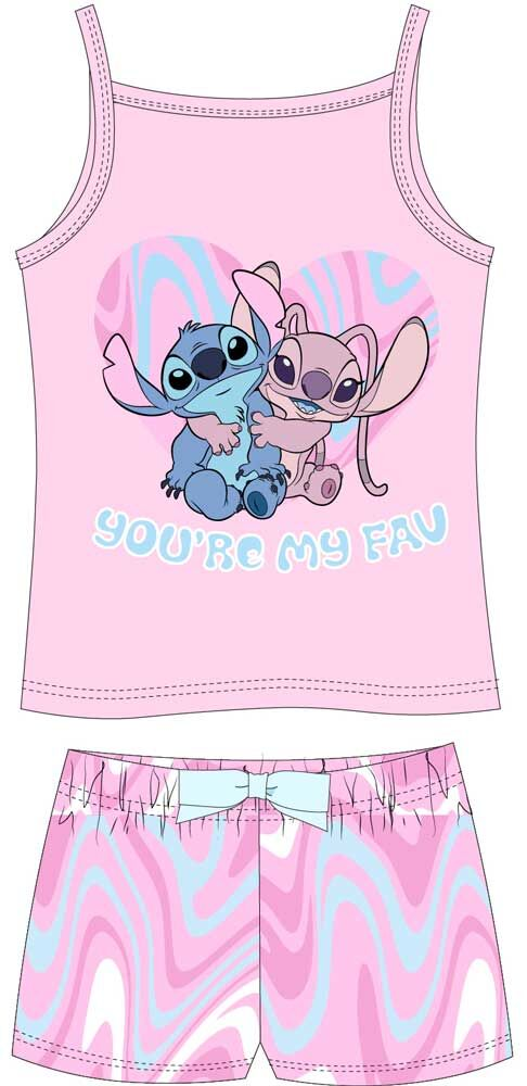Komplet piżamy dziewczęcej składa się z bluzki na ramiączkach i krótkich spodenek.