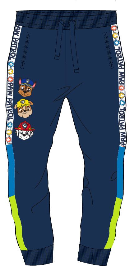 Długie spodnie z ulubionym dziecięcym bohaterem z bajki Psi Patrol. Przyjemny w dotyku materiał. Dwie boczne kieszonki, szeroka guma, ściagacz i luźny krój zapewnią komfort noszenia. Fason doskonale dopasowuje się do chłopięcej sylwetki. Spodnie na dole zakończone ściągaczem.