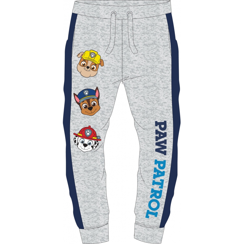Długie spodnie z ulubionym dziecięcym bohaterem z bajki Psi Patrol. Przyjemny w dotyku materiał. Dwie boczne kieszonki, szeroka guma, ściagacz i luźny krój zapewnią komfort noszenia. Fason doskonale dopasowuje się do chłopięcej sylwetki. Nogawki posiadają granatowy wzór z pieskami, spodnie na dole zakończone ściągaczem.