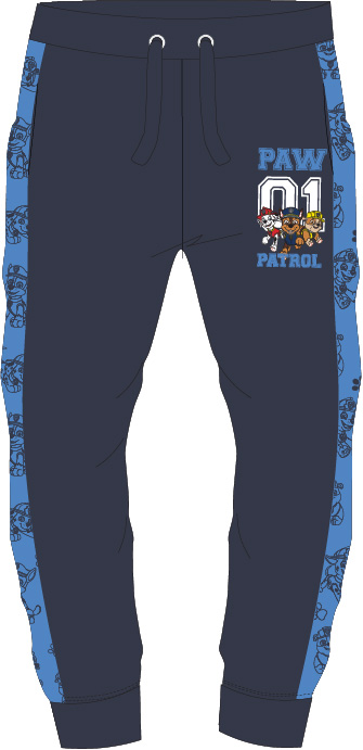 Długie spodnie z ulubionym dziecięcym bohaterem z bajki Psi Patrol. Przyjemny w dotyku materiał. Dwie boczne kieszonki, szeroka guma, ściagacz, sznureczki do wiązania i luźny krój zapewnią komfort noszenia. Fason doskonale dopasowuje się do chłopięcej sylwetki.