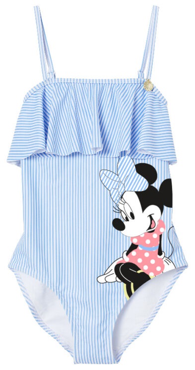 Jednoczęściowy kostium kąpielowy o bardzo ładnym fasonie, w żywej kolorystyce z dużym miękkim nadrukiem z Myszką Minie. Fantazyjnie wykończony. Kostium wykonany z dobrych jakościowo materiałów, naddaje się i naciąga dzięki czemu jest komfortowy w noszeniu.